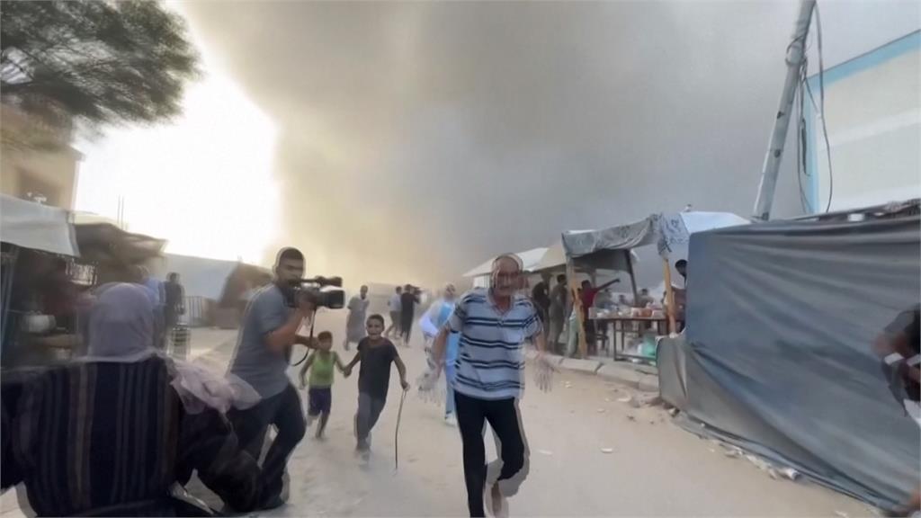 又有飛彈擊中大樓,民眾驚慌逃離。這裡是加薩南部、甘尤尼斯。一座充當難民收容所的聯合國學校,遭到空襲。