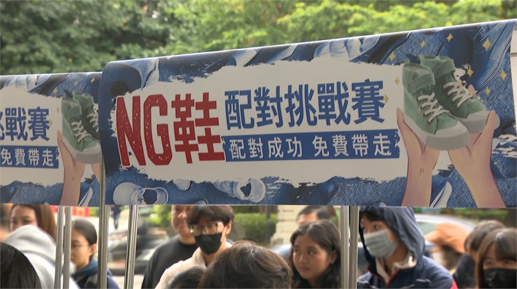 民眾大步一跨,衝到展示櫃前,手起刀落,搶在時間截止前,抓住自己的目標,在一旁等待的民眾躍躍欲試,迫不及待想要上前挑戰,因為在這裡,只要成功配對鞋子,就可以免費帶走一雙名牌NG鞋!