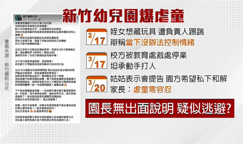 事發在上個月,新竹市一所幼兒園,當事孩童的姑姑,在臉書上發文表示,2月17日姪女看到喜歡的玩具,想收藏,沒想到卻被負責人施暴,她事後辯稱,"當下沒辦法控制情緒",而這樣的說法,家長根本無法接受,直到教育處裁處幼兒園停業,她才坦承動手打人。3月20日,姑姑表示會提告,園方則希望私下和解,但畢竟"虐童零容忍",加上園長從未出面,疑似在逃避!新竹市議員(時力)蔡惠婷:「這所幼兒園其實在之前已經劣跡斑斑,對多名小孩有不當管教的行為,包括他的師生比、空間都是違規,教育處也一再的裁罰,甚至在去年的時候還叫園所的老師,去上課做正向管教的輔導,但是還是一再的出事」。