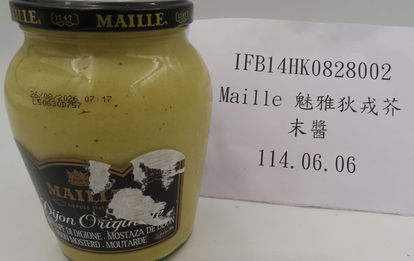 另外,「河洛企業股份有限公司」從法國進口的一批「芥末醬」,被檢出二氧化硫0.11 g/kg,但依據「食品添加物使用範圍及限量暨規格標準」,其他加工食品漂白劑偏亞硫酸氫鉀用量以二氧化硫殘留量計算須在0.030 g/kg以下。製造廠為:AMORA MAILLE,品牌名為:MAILLE。