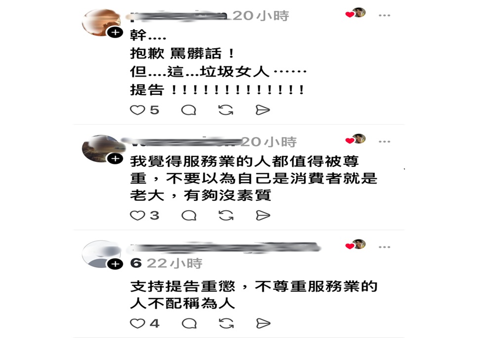 而女子在全家超商撒潑的畫面曝光後引起全民公憤,不少網友紛紛發文譴責,「妳那甚麼嘴臉,囂張個屁啊」、「店員欠妳的嗎?沒家教不要出門」、「妳媽媽有教妳怎麼當個人嗎?」還有網友要該名女子應該向全家店員下跪道歉。