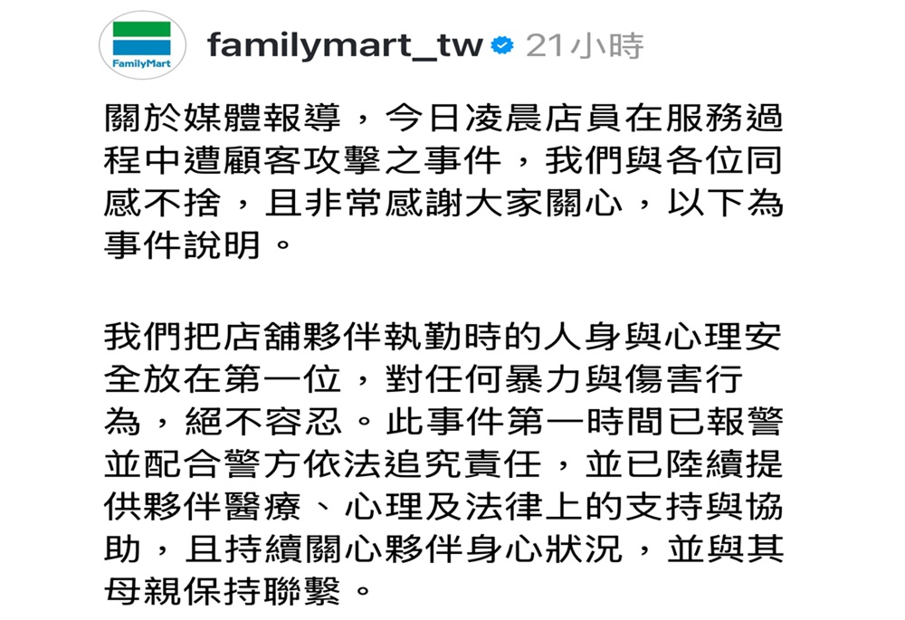 警方與業者呼籲,消費者應理性溝通、尊重服務人員,切勿因一時情緒釀成違法行為與人身傷害。本案目前仍由警方偵辦中,責任將依法釐清,全家也將配合司法機關進行調查,保障員工合法權益。