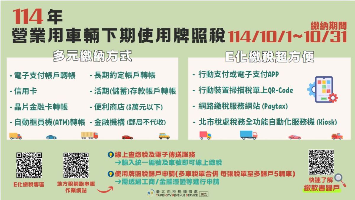 自今日起,營業用車輛下期使用牌照稅開始徵收,繳納期限至10月31日止。若未收到繳款書,可透過地方稅網路系統輸入車牌號碼與統一編號完成查繳。