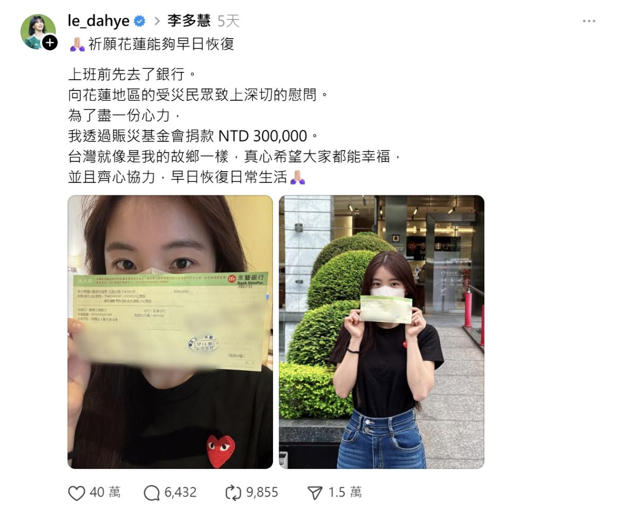 圖/李多慧日前才剛捐出30萬元援助花蓮災區。(翻攝 Threads/le_dahye)