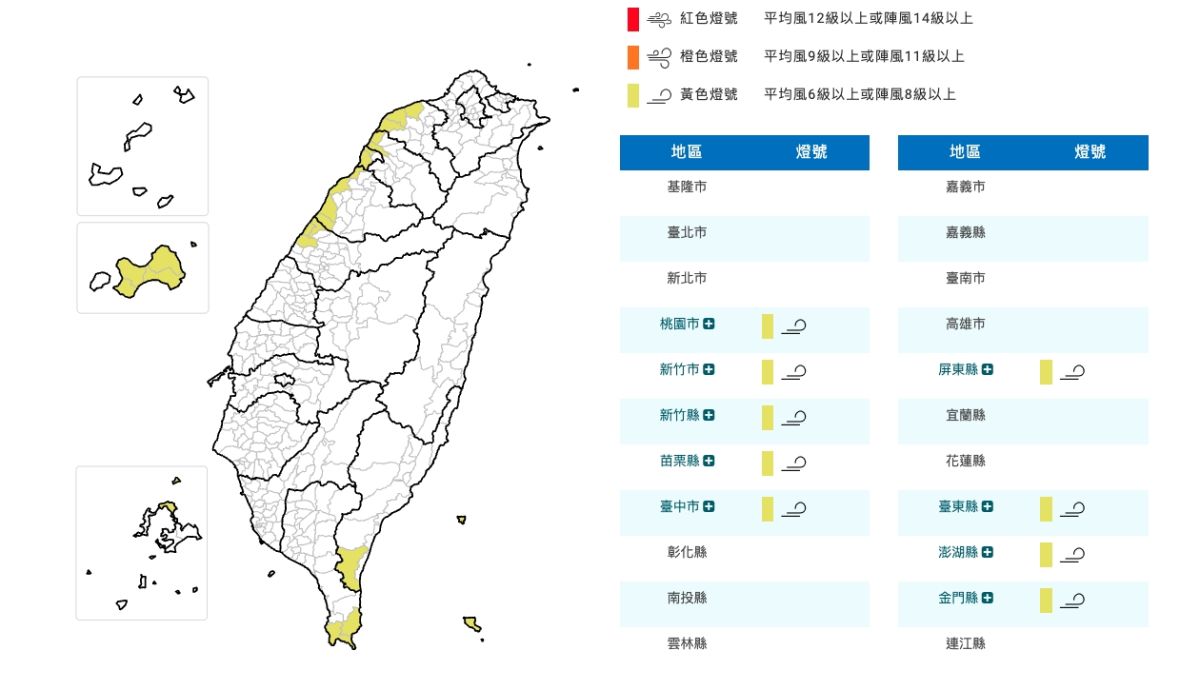 針對海上風浪狀況,氣象署提醒蘭嶼、綠島、澎湖、金門與連江等外島地區,可能出現強陣風與長浪,沿海及跨海橋梁風勢尤為明顯。民眾若計畫出海、垂釣或從事水上活動,務必注意安全,避免靠近岸邊或礁岩區域。