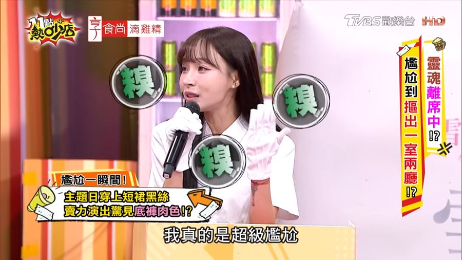林襄笑說,那天她挑選絲襪時沒多想,只覺得款式看起來特別方便,直到上場後才發現不對勁。所謂「免脫絲襪」在下身部位有個開口設計,原是為了方便如廁使用,沒想到搭配短裙跳舞時「完全遮不住」,她雖有穿黑色內褲,但仍有肌膚外露。她尷尬回憶,「影片現在網路上還看得到,我只要滑到就覺得超級尷尬,整個頭皮發麻!」