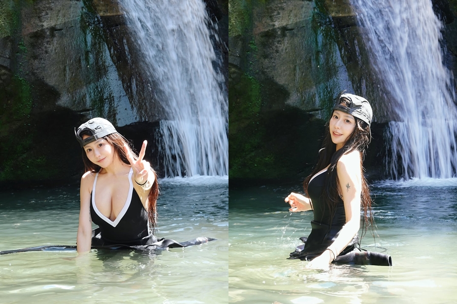 從畫面可見,梓梓身穿黑色連身泳衣,領口採深V剪裁,肩帶與邊緣以白色滾邊設計,襯托出健康膚色與完美曲線。她整個人泡在溪水中,頭上反戴黑色棒球帽,眼神時而俏皮、時而回眸,舉手投足之間散發出自信與自然美感,性感中帶點野性氣息,讓粉絲直呼,「比風景還美!」
