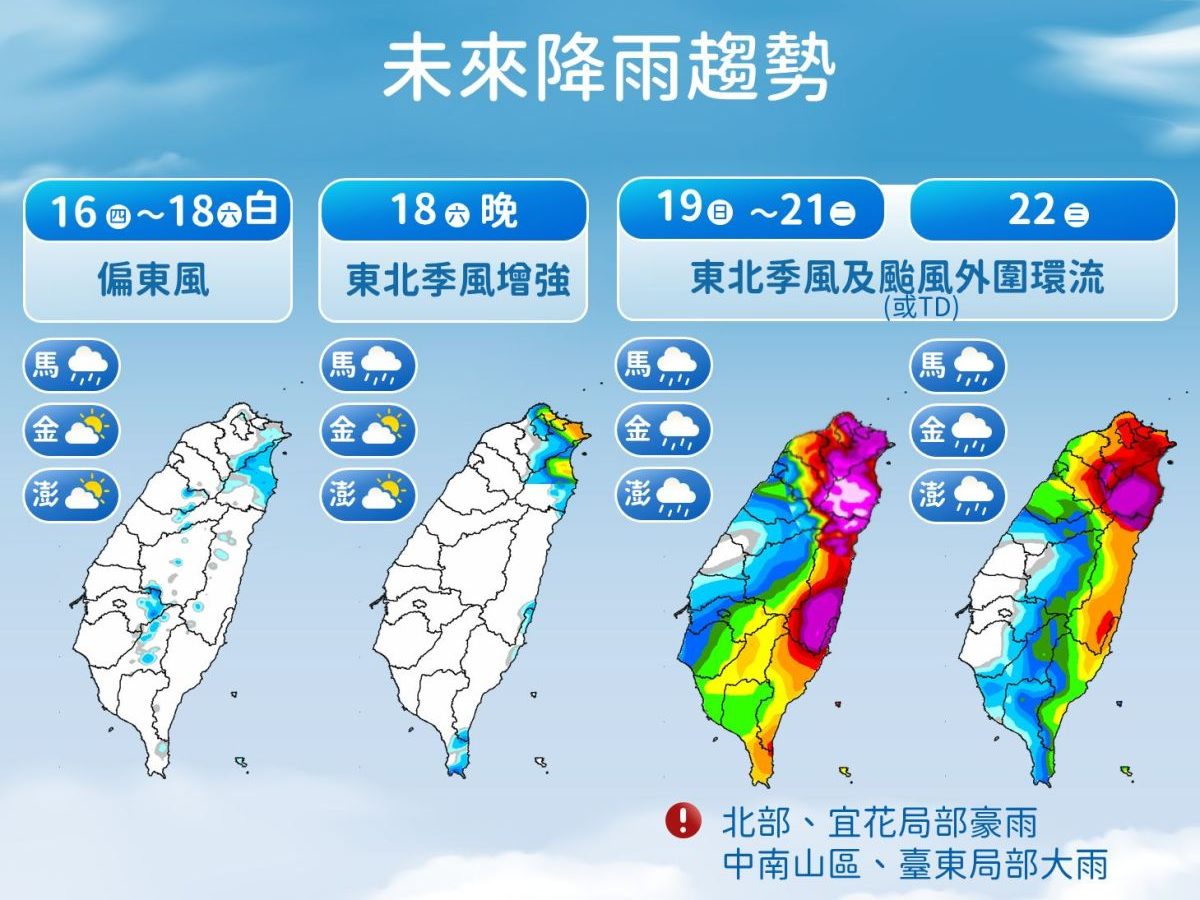 圖/從本週末開始,東北季風即將南下,加上南方系統外圍雲系北抬,台灣將逐步轉為濕涼天氣型態。(氣象署 提供)