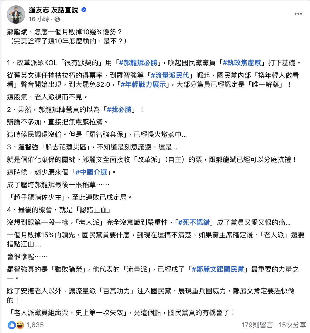 圖/媒體人羅友志在粉絲專頁提出郝龍斌敗選四關鍵。(翻攝自羅友志 友話直說FB)
