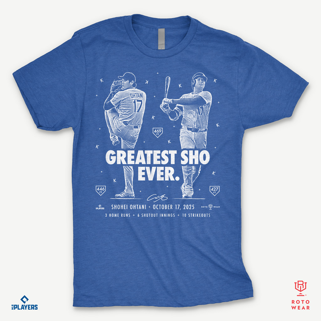 比賽結束約10小時後,運動品牌RotoWear即在社群平台X(原Twitter)宣布推出紀念T恤「Greatest Sho Ever」,售價30美元。T恤設計以黑底搭配大谷的投打剪影,並印上「2025年10月17日,Shohei Ohtani於季後賽擊出3支全壘打並以6局無失分、10次三振率領洛杉磯晉級冠軍系列賽」的文字。該品牌以「神速商品化」聞名,曾在NBA、NFL等賽事後數小時內推出限量商品,此次再次展現驚人速度,引來全球球迷留言「動作太快了」、「這速度是外星等級」、「我已經下單了!」。