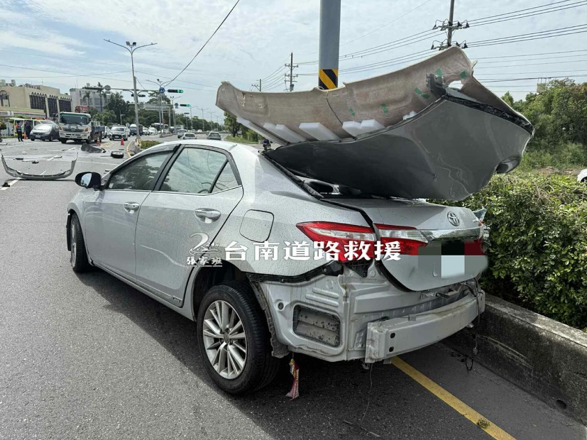 圖/台南市新市區今(22)日上午發生嚴重交通事故,一輛自小客車不明原因撞上停在路邊的大貨車,猛烈撞擊造成車頭嚴重變形,車頂被削飛。(翻攝 台南道路救援(張家班) 臉書)