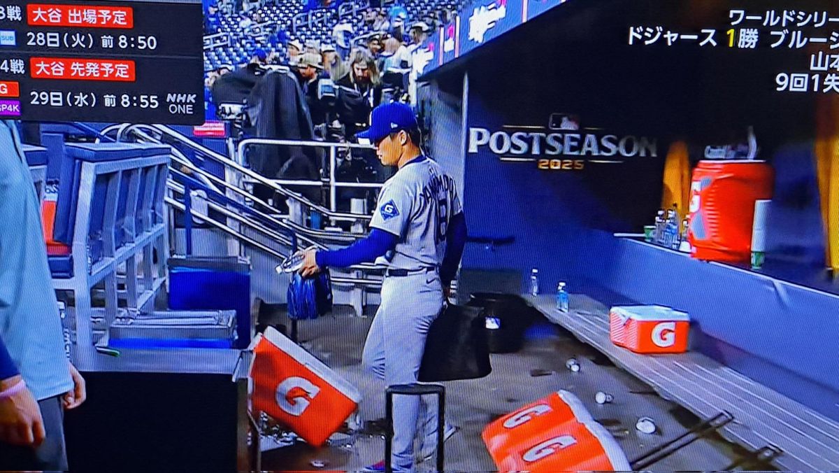 不過最讓球迷動容的畫面出現在比賽結束後——當全隊慶祝勝利時,山本並未馬上返回休息室,而是默默蹲下撿起散落的水瓶與紙巾,仔細整理乾淨後才離開。這一幕被《NHK》與《FOX Sports》鏡頭拍下並在網路瘋傳,節目評論員班.維蘭德(Ben Verlander)在社群平台上感嘆:「山本在連兩場完投後,竟還親自清理整個休息區!」