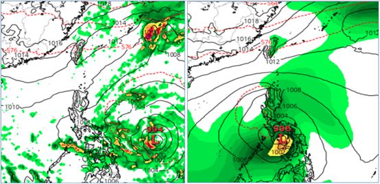 圖/歐洲模式(左)及其AI模式(右),下週三(5日)20時模擬顯示,西北太平洋仍有熱帶系統發展。(翻攝 氣象應用推廣基金會 網站)