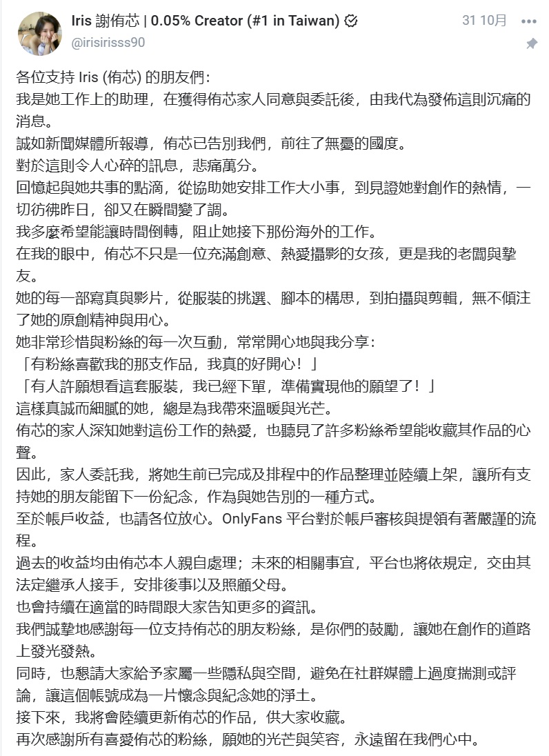助理進一步說明,謝侑芯生前帳戶收益均由本人管理,後續將依OnlyFans平台規定及法定程序處理,未來收益將用於後事安排與照顧雙親,同時會陸續上傳她生前已完成的作品。