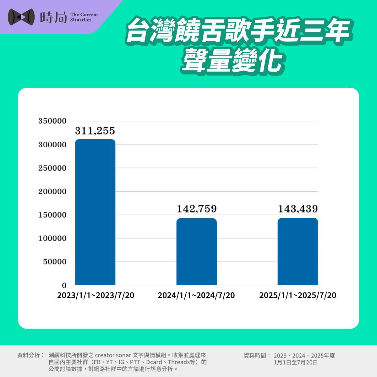本次聲量統計由《時局 The Current Situation》平台提供,資料來源為潮網科技所開發之Creator sonar文字輿情模組。本次分析涵蓋的時間範圍為2023年、2024年、2025年1月1日至7月20日。分析涵蓋國內主要社群(FB、YT、IG、PTT、Dcard、Threads),透過語意辨識與資料演算技術,整理特定期間內與關鍵詞相關之公開討論總量。