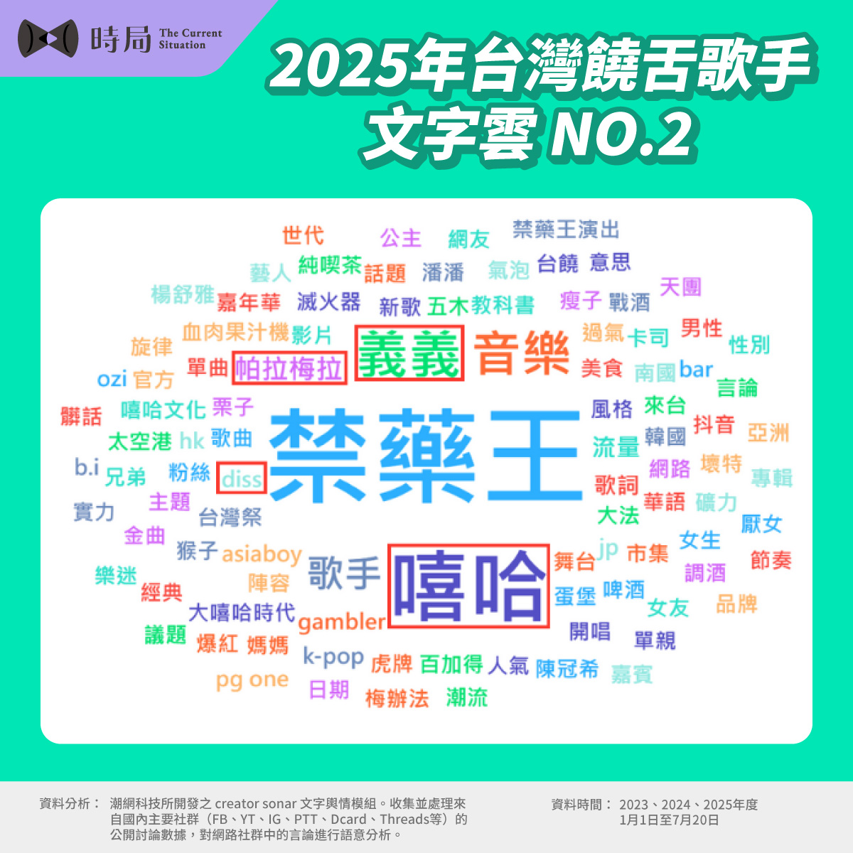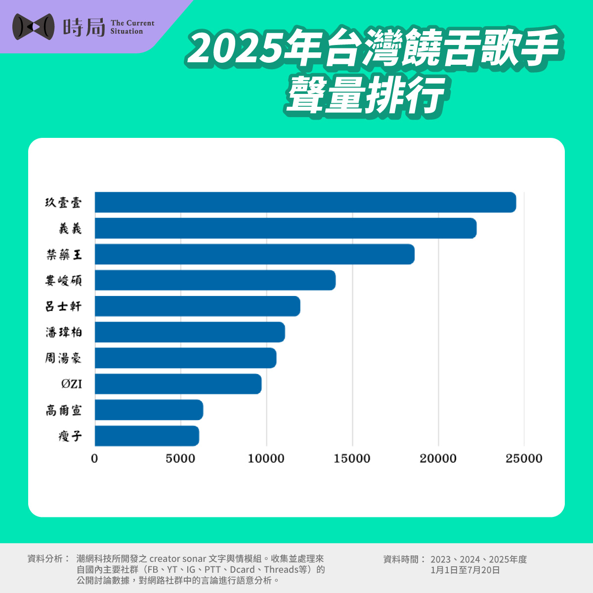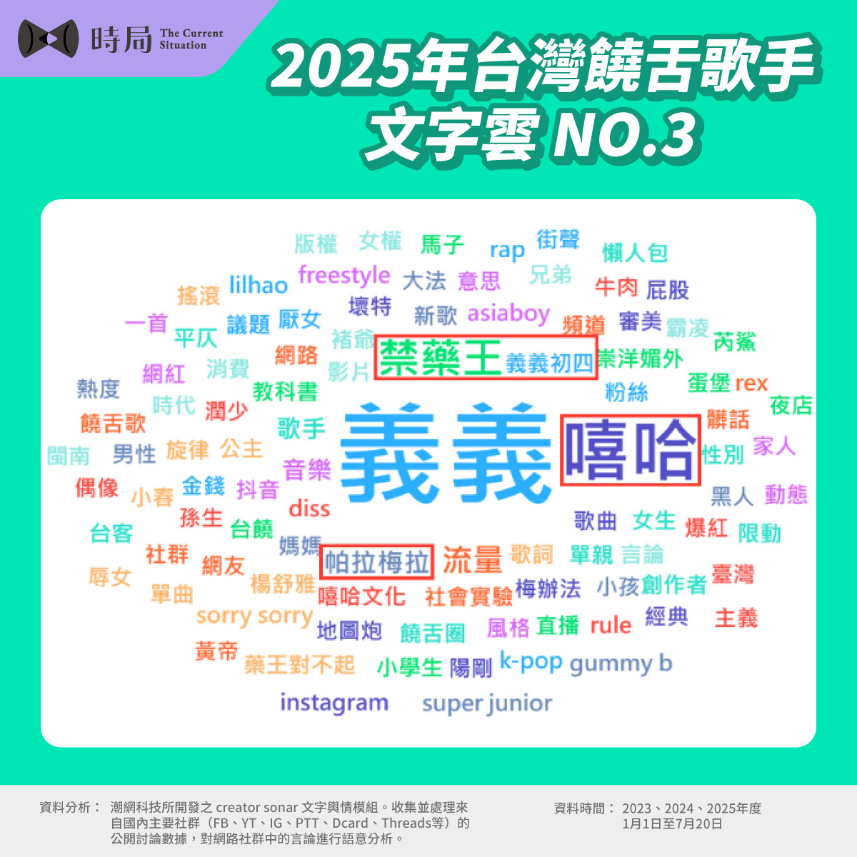 《時局》網路聲量觀察站以2023-2025年台灣饒舌歌手聲量的輿情分析為核心,拆解當前嘻哈圈的動態與發展趨勢,並探討誰在引領話題?