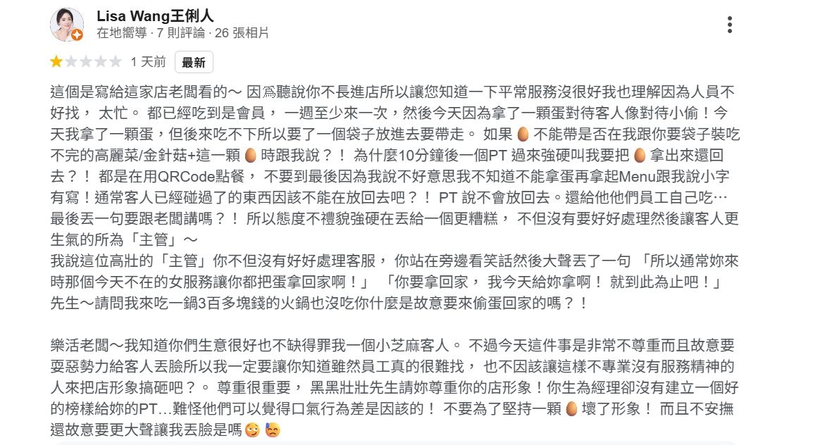 (娛樂中心/綜合報導)藝人王俐人於19日前往台北市大安區知名火鍋店用餐時,因欲將自助吧的一顆雞蛋帶回家遭店家制止,引發雙方衝突。事後王俐人在Google評論留下一星,控訴店員「像對待小偷」,而這篇評論曝光後,卻在網路上遭到多數網友反向支持店家,引發熱議。