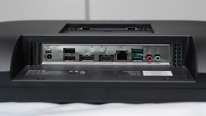 底部的 I/O 有 120 W 電源插頭、USB 3.2 兩個、USB 2.0 兩個、DP 1.4、HDMI 2.0、RJ-45 以及基本的喇叭麥克風接頭,給的算是足夠豐富。雖然不像中高階的桌上型電腦那麼豪華,但通常也比這個價位的筆記型電腦好上非常多了。