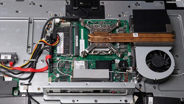 記憶體為筆電的 SO-DIMM 規格,原廠配備了威剛 DDR5–5600 16 GB,共有兩個插槽,可升級至最高 128 GB。處理器是標準版的 Intel Core Ultra 225,整台電腦就只有一個風扇。理論上是可以自行升級 U7,但畢竟連同螢幕共用一個 120 W 的電源,應該還是乖乖使用 U5 就好了。