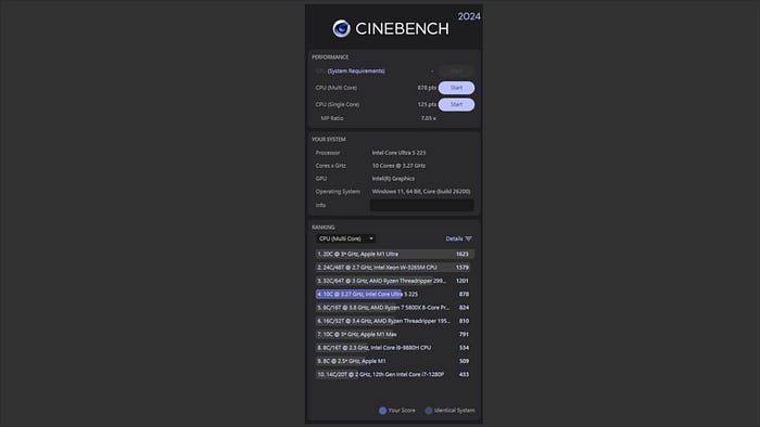 都設定好後就來跑分一下,首先看到 Cinebench R24,單核 125,多核 878。相較網路上找到一般別人評測的 Intel Core Ultra 5 225 幾乎沒差,僅多核稍微落後,但也算是在誤差範圍內,看來散熱是沒什麼太大問題的。